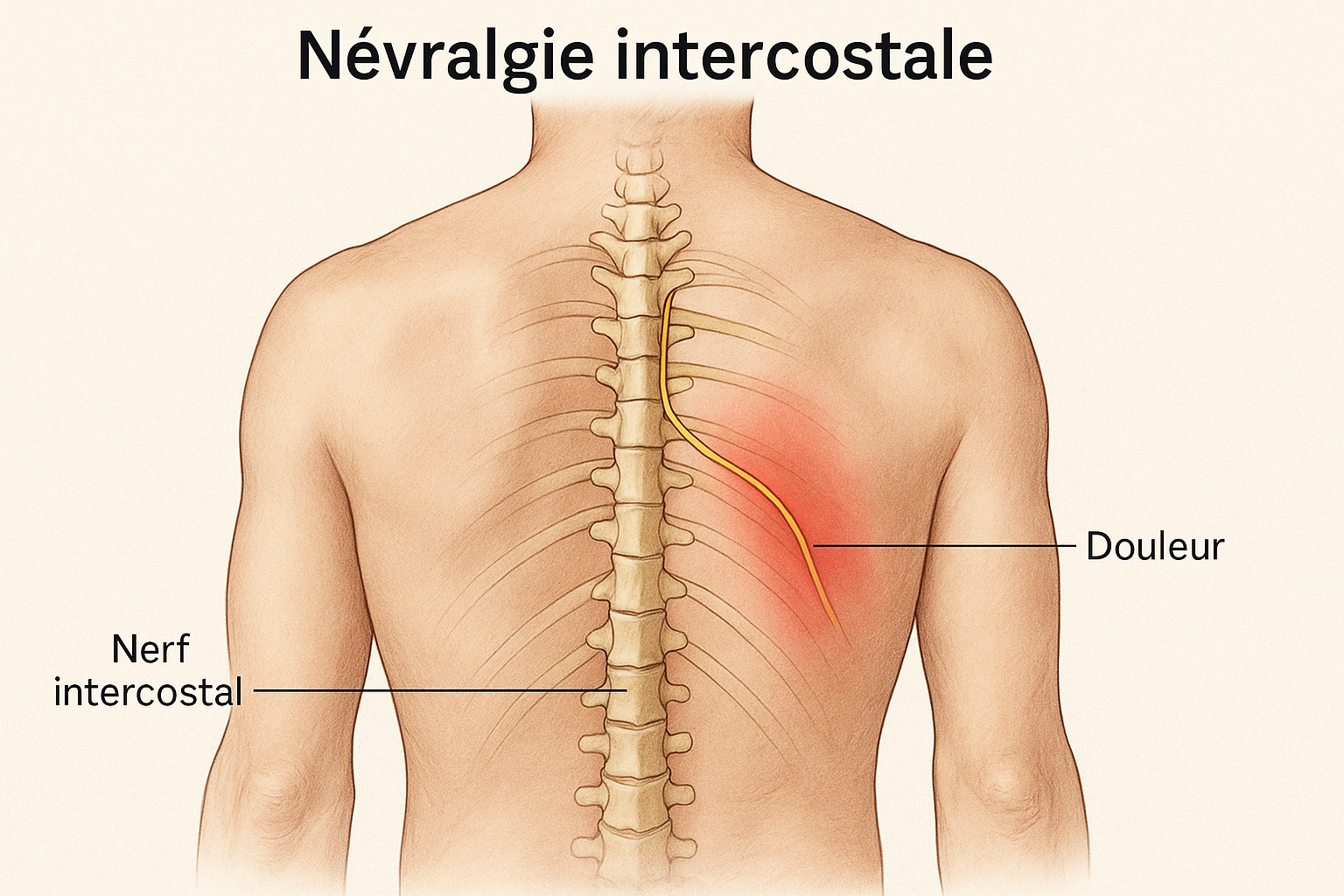 La névralgie intercostale correspond à une irritation ou une inflammation d’un des nerfs intercostaux, qui cheminent entre les côtes et assurent à la fois la motricité des muscles respiratoires et la sensibilité de la paroi thoracique. Lorsque l’un de ces nerfs est comprimé ou irrité, il peut provoquer une douleur vive, brûlante ou électrisante qui suit souvent le trajet d’une côte. La douleur peut être ressentie sur un seul côté du thorax, parfois jusqu’au sternum ou vers le dos, et peut être aggravée par les mouvements respiratoires, la toux ou certaines rotations du tronc.